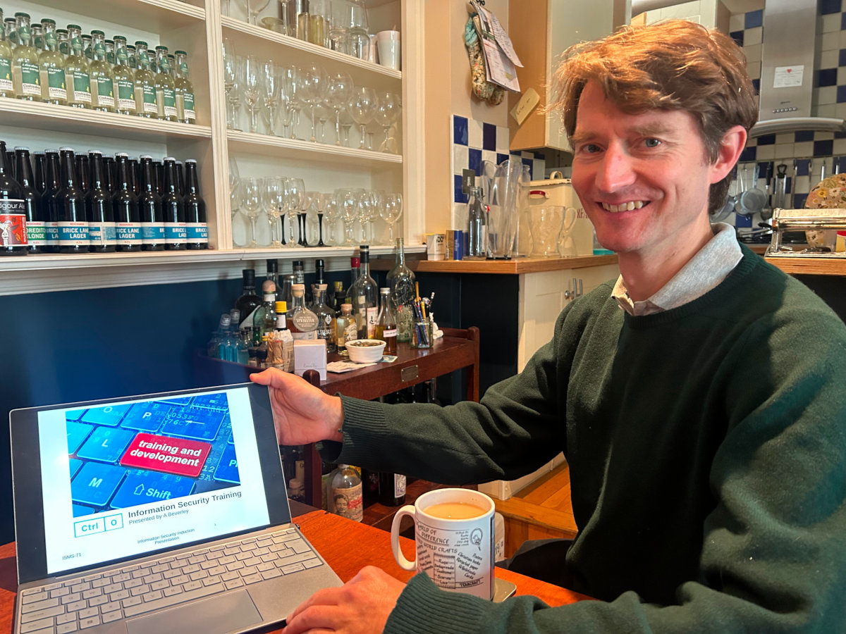CEO Andy Beverley with the company’s presentation on the Information Security processes that Ctrl O employs. He runs through this with all new employees and freelancers. (He would like to clarify that all the bottles are just for decoration and are in fact left over from his wedding 6 years ago!)