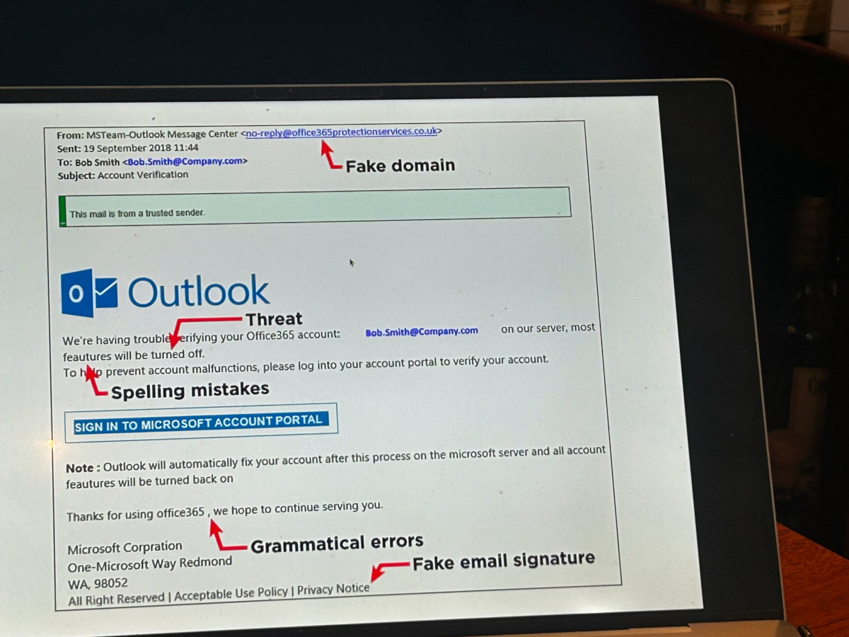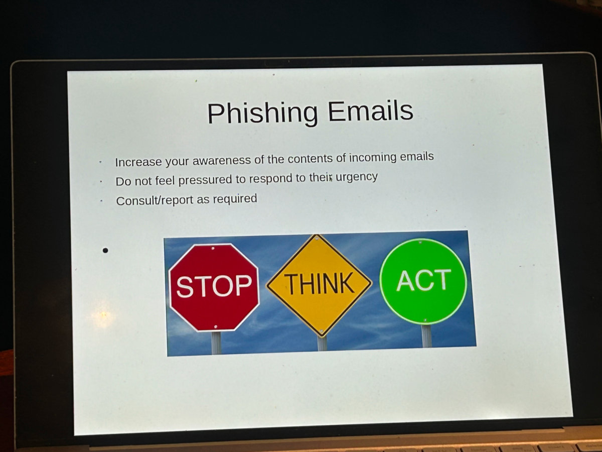 Andy explained that there’s a secure (confidential) method for storing passwords, and that all of Ctrl O’s data is stored on a private cloud. In his presentation, there was a page on dealing with phishing emails, and a good diagram on how to tell if an email is fake.